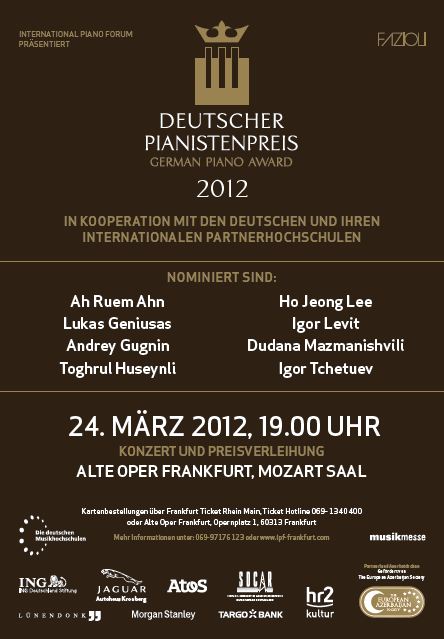Am Samstag, den 24. März 2012, werden die Nominierten des Deutschen Pianistenpreises 2012 im Rahmen eines öffentlichen Konzertes in der Alten Oper Frankfurt am Main ihr Programm vom Vortag der Öffentlichkeit vorstellen. Die Veranstaltung gipfelt mit der Bekanntgabe des Preisträgers sowie der anschließenden Preisverleihung.
